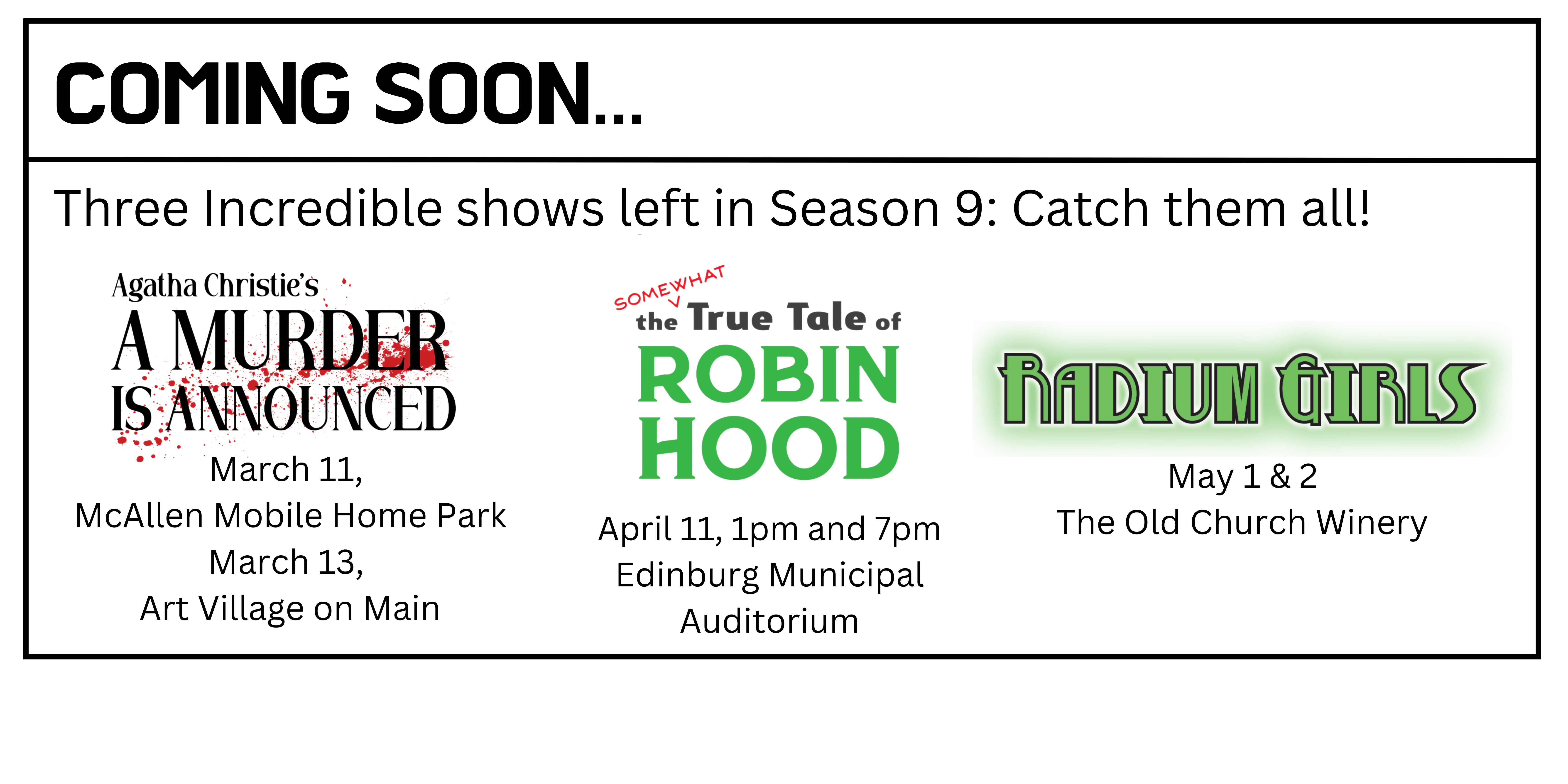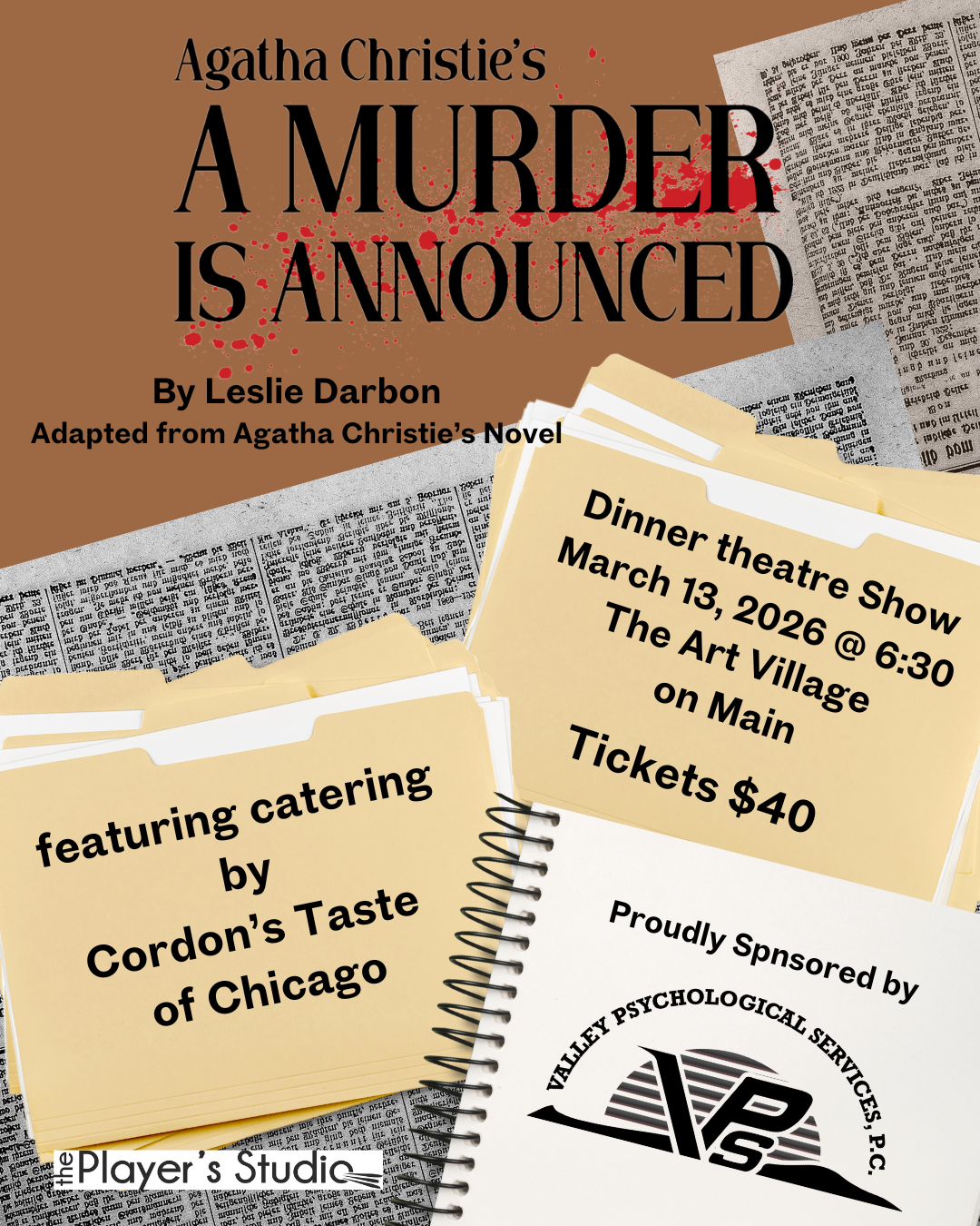 Join The Player's Studio Community group for our third major production. This year we once again invite you to The Art Village on Main in downtown McAllen where you will enjoy a three course meal from Cordon's Taste of Chicago plus a full length play. Witness for yourself why Agatha Christie is considered the Queen of Mystery with this stage adaptation of A Murder Is Announced. The small estate of Little Paddocks is thrown into chaos when the morning paper contains an advertisement claiming a Murder will take place at the home that very evening. Everyone assumes this is a joke, until it comes true. Now local police inspector Dermot Craddock and amateur sleuth Miss Jane Marple must solve the case before more people wind up dead.