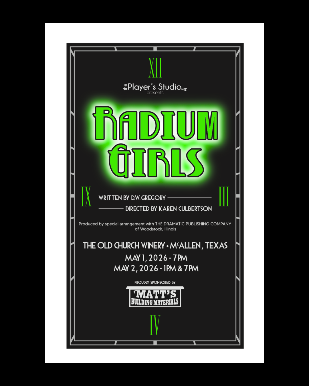 It's the early 1900s and radium is hailed as a miracle for everything from curing cancer to scientific advancements in technology. Among its many uses it is used to make the numbers on watches glow in the dark - a useful function especially for the military. Young American women flood new industries like the US Radium Corps to paint the tiny dials that may save a soldier's life. However, the very substance touted to save is actually killing the women in the factories. When Grace Fryer and her friends begin to grow seriously ill they seek out compensation from the company they trusted only to be turned away. Now they must navigate corporate greed, the court system, and the doubts of family and strangers alike just to see that they are given the justice they deserve. Radium Girls is an award winning play by DW Gregory based on true events. The show was originally produced by Playwrights Theatre of New Jersey and developed with a commissioning grant from The Ensemble Studio Theatre/Alfred P. Sloan Foundation Science & Technology Project. Since then it has been produced by hundreds of educational programs. It is an important story as relevant today as it ever has been.