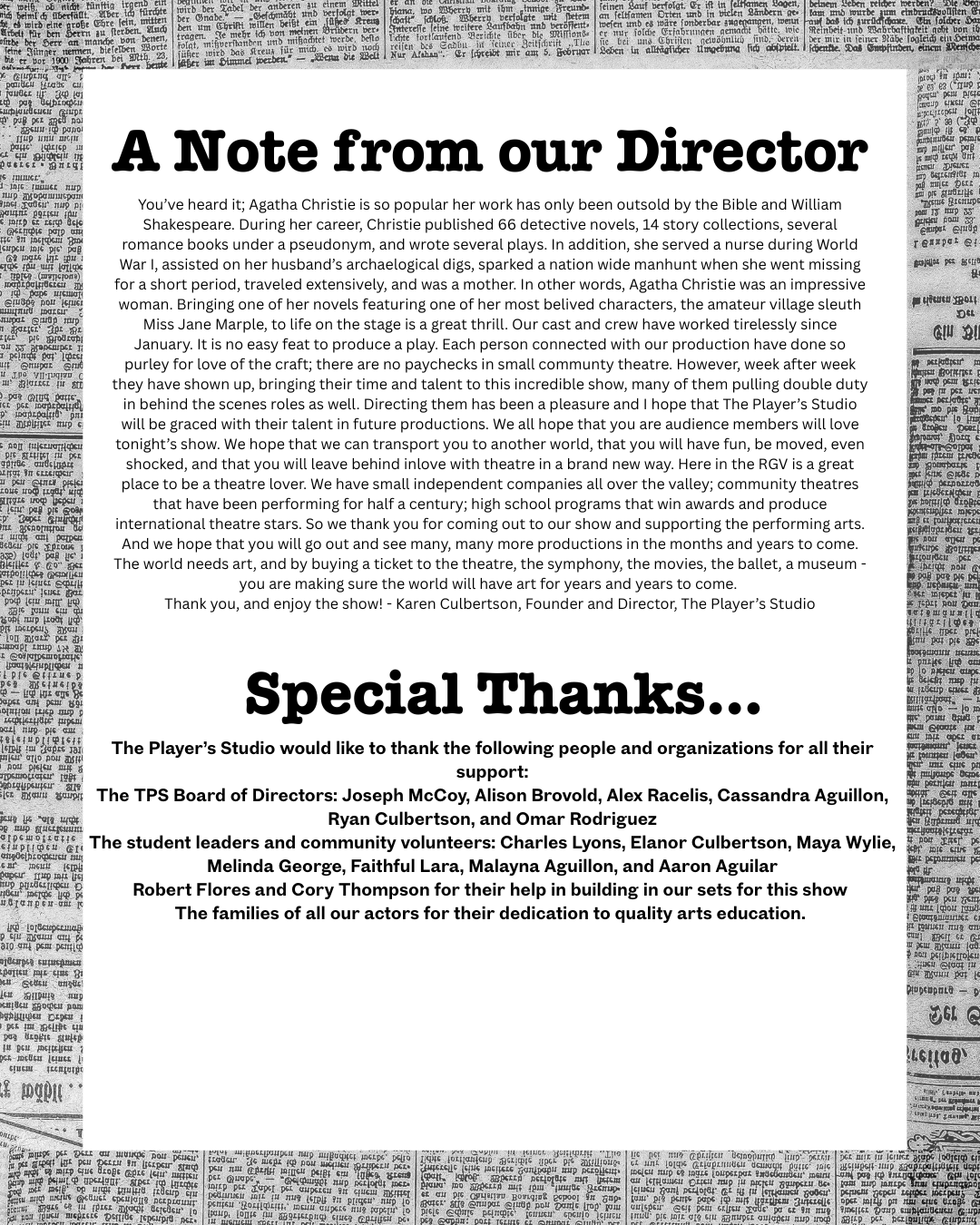 Karen Culbertson is the founder and director of The Player's Studio. She has directed more than 30 plays over nine seasons with the company. Among her favorites are The Mousetrap, You Can't Take it With You, The Ash Girl, and the Alibis. Karen is also a playwright and has written ten productions including adaptations of Little Women and Peter Pan. Her play Wonderland has been performed at a high school in Illinois and in Canada. She would like to thank the cast and crew of A Murder is Announced for all their hard work and dedication to this production and is especially grateful to her children and her husband for all their support.